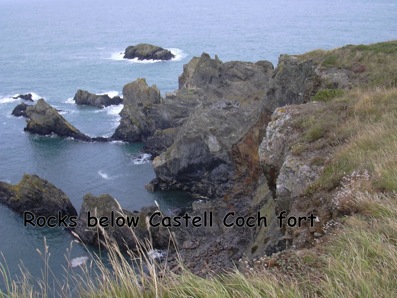 On almost every promontory on this part of the coast (and indeed right round Pembrokeshire) there is a prehistoric fort (most of which I find difficult to identify, because of the vegetation). This section was no exception, boasting no less than two Castell Coch (Red Castles). The first one was reasonably easy to see on approach, based above a spectacular rock formation at Porth Tre-Wen. Not far from here an expedition of about 12 of young people were being led in a line along the path. All stopped to allow me to pass - I felt I should give a salute like HMQ.Abereiddi beach, a little further along, was also empty except for the sea and the car park held only a few cars together with a number of coasteering company mini-buses. At one period Abereiddi was a bustling slate quarrying village but now it is whole-heartedly a tourist destination, with a few jolly, painted cottages.